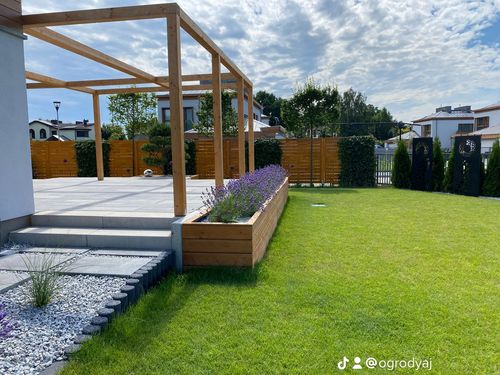 Przy budowie tego ogrodu łączyliśmy płotki w kolorze pinii, wraz z zielonymi ekranami z bluszczu. Na przestronnym tarasie znajduje się nie tylko drewniana pergola, z możliwością pełnego zadaszenia, ale także jacuzzi, które umila czas w chłodniejsze wieczory. Miejsce na palenisko zostało zlokalizowane dość blisko tarasu. Szpalery z grabów mają tworzą zieloną zasłonę na dwóch bokach działki. Lawenda w porze kwitnienia powala swoim kolorem, a domek narzędziowy charakterem wkomponowuje się w całe otoczenie.
