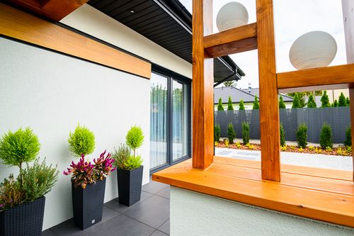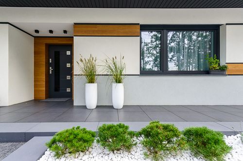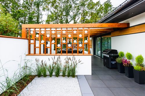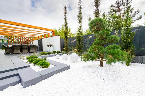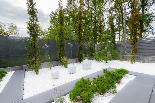Zamysłem właścicieli było usunięcie trawy z ogrodu kosztem białego otoczaka, więc cały ogród mamy głównie wysypany tym kamieniem. Dla kontrastu znajdziemy w ogrodzie grafitowe płyty, drewniane elementy oraz soczystą zieleń roślin, gdzie na uwagę zasługują piękne sosny typu bonsai. Pomimo usunięcia trawy, która wymaga częstego koszenia, taki ogród też jest wymagający – szczególnie, wtedy gdy się chce zachować czystą biel kamienia 😊