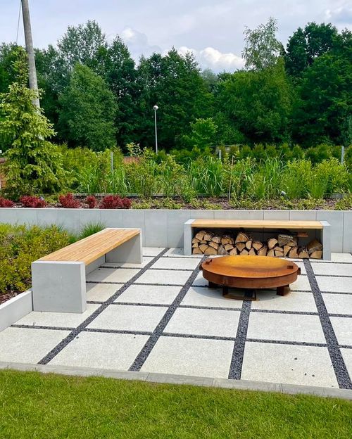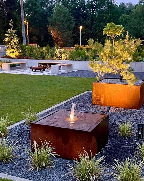 W ogrodzie znajduje się duży i przestronny taras, którydolny poziom jest zbudowany z kostki brukowej. Latem to miejsce zamienia się wstrefę basenową. Dobrana roślinność tworzy niesamowite zestawieniekolorystyczne, które zapiera dech w piersiach. Dominantą ogrodu jest dużadonica na końcu ogrodu, w którą wkomponowana jest altana wraz z miejscemwypoczynkowym, oraz strefa relaksu z paleniskiem. Szczególną uwagę zwraca nasiebie donica z kortenem, obok której mamy element wodny. W strefie wejściowejwita nas szpaler miskantów i iglaki w stylu bonsai.