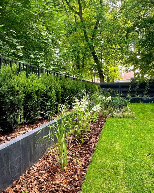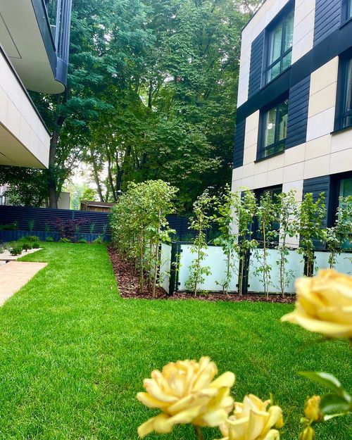 Ogród został zbudowany w dość zacienionej części osiedla. Różnica poziomów została zniwelowana grafitową donicą z palisady. Ze względu na stanowisko dobraliśmy głównie roślinność cieniolubną, a w tych częściach ogrodu, gdzie widać czasem słońce zaszaleliśmy. Na ogrodzie zbudowana została siłownia, z której można korzystać przez cały rok. Do ogrodu zmieściliśmy również warzywniki.